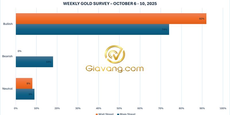Cuộc khảo sát vàng hàng tuần mới nhất của Kitco News cho thấy Phố Wall vẫn lạc quan hơn bao giờ hết sau một màn trình diễn nổi bật khác, trong khi các nhà đầu tư Main Street cũng ngày càng lạc quan về tiềm năng tăng giá của kim loại quý này vào tuần tới.
