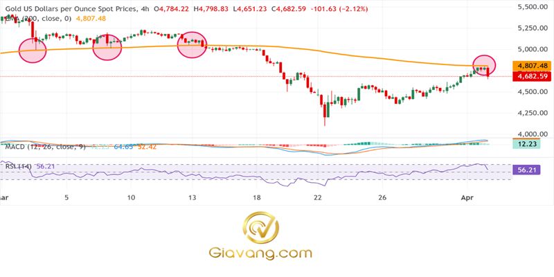 Ở chiều tăng, kháng cự ban đầu xuất hiện ở mức đỉnh dao động gần đây gần $4,765, với việc phá vỡ mức này sẽ lộ ra vùng $4,820-$4,830, nơi đường trung bình động hàm mũ 200 kỳ củng cố một rào cản khó khăn hơn.