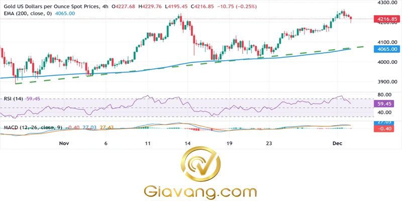 Giá vàng (XAU/USD) đảo ngược đà giảm trong phiên giao dịch châu Á xuống dưới mức 4.200 USD và giao dịch với mức giảm nhẹ ngay dưới mức cao nhất kể từ ngày 20 tháng 10, chạm mức của ngày hôm trước.