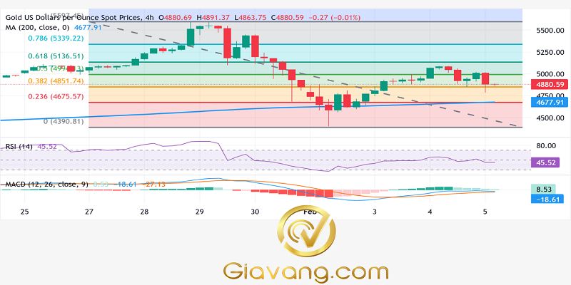 Nếu không vượt qua được mức $4,994.13, giá sẽ giữ nguyên phạm vi giao dịch, trong khi các đợt giảm giá sẽ được hỗ trợ bởi đường SMA 200 kỳ đang tăng quanh mức $4,677.91.