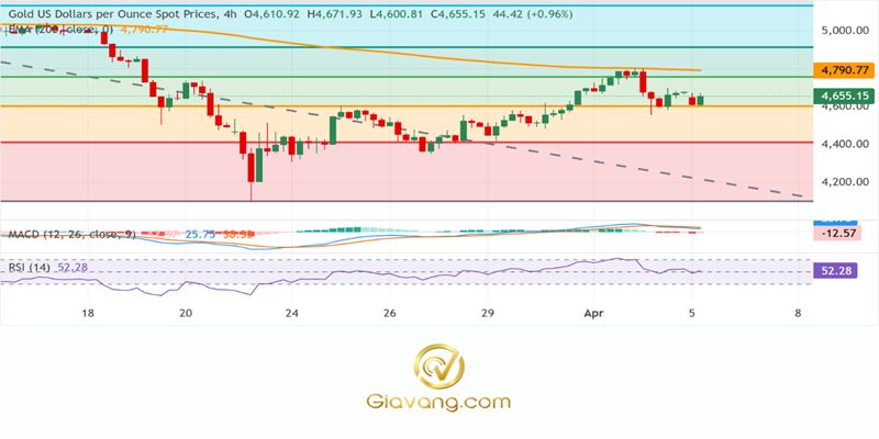 Ở chiều giảm, mức hỗ trợ ban đầu nằm gần mức thoái lui Fibonacci 38,2%, nếu phá vỡ mức này sẽ dẫn đến đợt giảm sâu hơn xuống mức thoái lui 23,6% quanh mức $4.411. Một đợt giảm bền vững dưới vùng này sẽ mở đường cho sự giảm giá xuống vùng tâm lý $4.300.