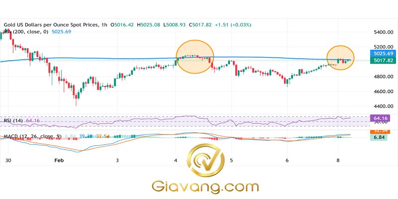 Chỉ số sức mạnh tương đối (RSI) ở mức 64 (tăng giá) nhưng chưa chạm vùng quá mua. Đường trung bình động 200 giờ (SMA 200) đang dốc xuống, duy trì xu hướng giảm trong ngày và đóng vai trò là ngưỡng kháng cự tức thời.