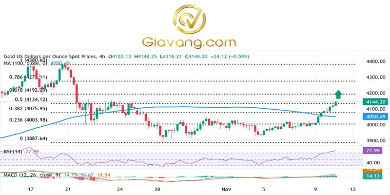Giá vàng (XAU/USD) giảm nhẹ khỏi vùng cung 4.150 đô la, hay mức cao nhất trong gần ba tuần được chạm tới trong phiên giao dịch châu Á hôm thứ Ba, do những diễn biến tích cực hướng tới việc mở cửa trở lại chính phủ Mỹ đã làm suy yếu nhu cầu trú ẩn an toàn.