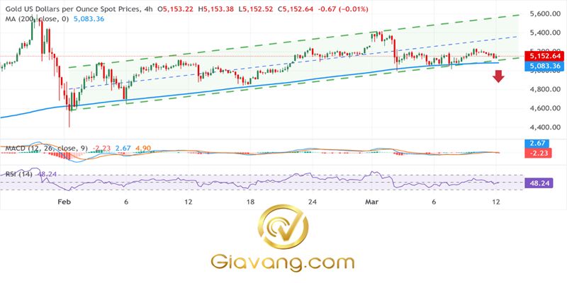 Cặp tỷ giá XAU/USD đang giữ vững trên đường trung bình động đơn giản (SMA) 200 kỳ dốc lên trên biểu đồ 4 giờ, quanh mức 5.083 USD, giữ cho xu hướng tăng rộng hơn được duy trì trong kênh tăng dần. Trong khi đó, biểu đồ MACD (Moving Average Convergence Divergence) đã giảm nhẹ so với mức cao gần đây nhưng vẫn nằm trong vùng tích cực, cho thấy động lượng đang hạ nhiệt chứ không phải đảo chiều.