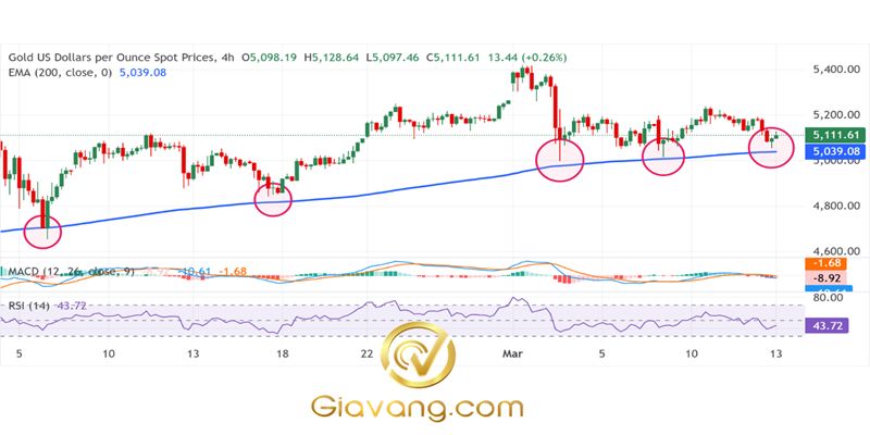 Việc giá phục hồi vượt qua mức $5,160–$5,200 có thể kéo chỉ báo MACD trở lại đường số 0 và đẩy chỉ báo RSI tiến gần hơn đến 50, củng cố xu hướng tăng giá, trong khi việc không giữ vững được vùng hỗ trợ $5,090–$5,039 sẽ chuyển trọng tâm sang triển vọng trung lập hoặc thậm chí giảm giá trên biểu đồ 4 giờ.