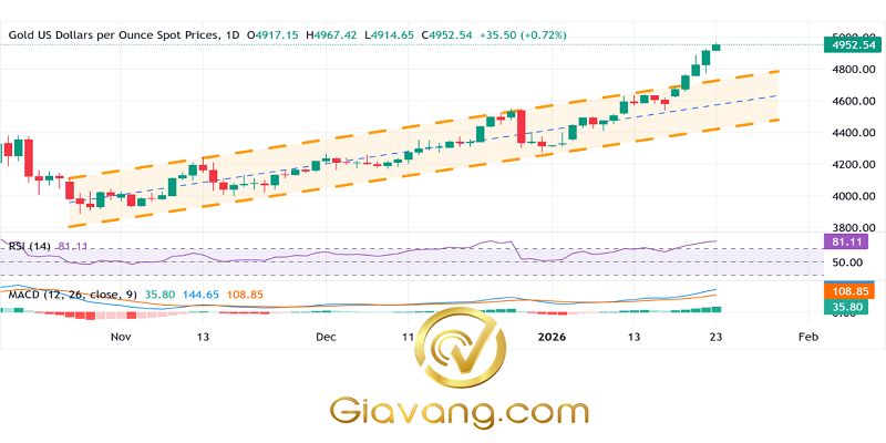 Giá vàng (XAU/USD) tiếp tục xu hướng tăng trong tuần và đạt đỉnh cao nhất mọi thời đại mới, quanh mức 4.967 USD, trong phiên giao dịch châu Á ngày thứ Sáu. Mặt hàng này vẫn đang trên đà ghi nhận mức tăng mạnh trong tuần bất chấp căng thẳng địa chính trị giảm bớt sau khi Tổng thống Mỹ Donald Trump thay đổi lập trường về Greenland.