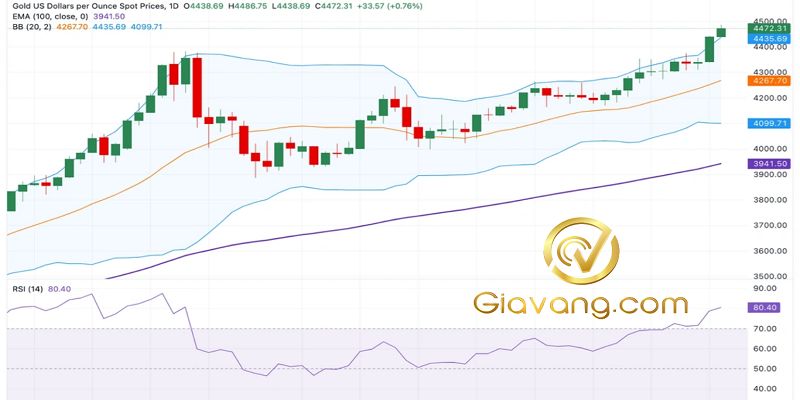 Giá vàng tăng nhẹ trong ngày. Theo biểu đồ hàng ngày, triển vọng tích cực của kim loại quý này vẫn được duy trì, với giá giữ vững trên đường trung bình động hàm mũ 100 ngày (EMA). Dải Bollinger Bands mở rộng, cho thấy xu hướng tăng giá mạnh mẽ hơn.