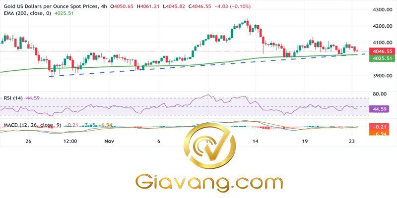Về mặt kỹ thuật, cặp XAU/USD cho đến nay đã bảo vệ được đường xu hướng tăng kéo dài từ cuối tháng 10. Mức hỗ trợ này hiện đang được neo giữ gần vùng 4.030 đô la và hiện trùng với đường trung bình động hàm mũ (EMA) 200 kỳ trên biểu đồ 4 giờ.