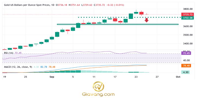 Về mặt kỹ thuật, việc giá vàng không vượt qua được mốc 3.800 đô la trong tuần này có thể được coi là dấu hiệu đầu tiên cho thấy đà tăng có thể suy yếu trong bối cảnh Chỉ số Sức mạnh Tương đối (RSI) vẫn đang trong tình trạng quá mua trên biểu đồ hàng ngày.